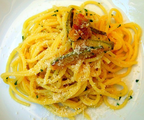 In una padella far rosolare la cipolla (tagliata finemente) con un po d'olio. Aggiungervi le zucchine, anch'esse tagliate fine, e farle dorare.